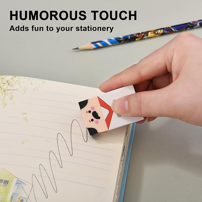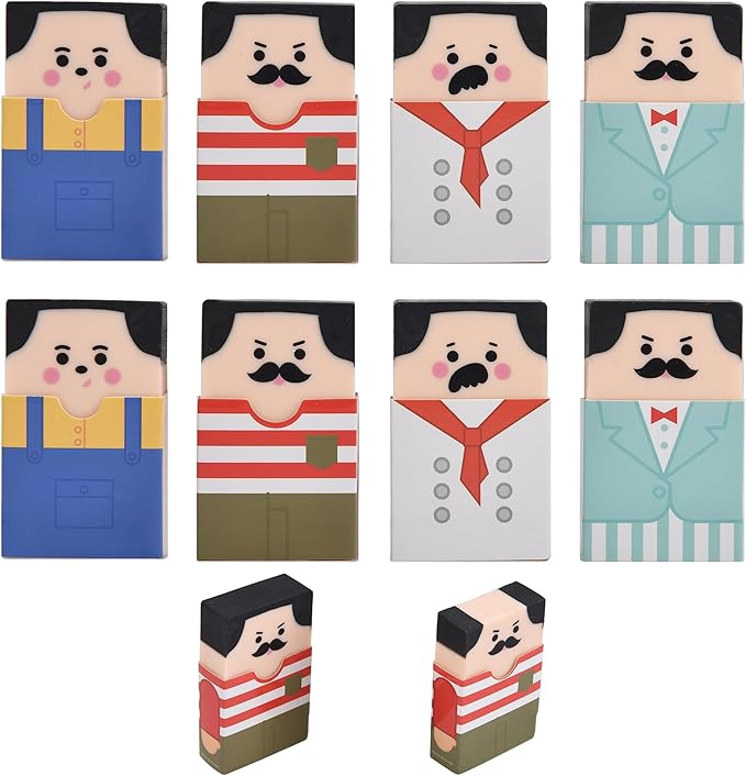- Humorous Design: Features 8 playful erasers shaped like men whose hair gradually disappears, revealing a comical bald appearance