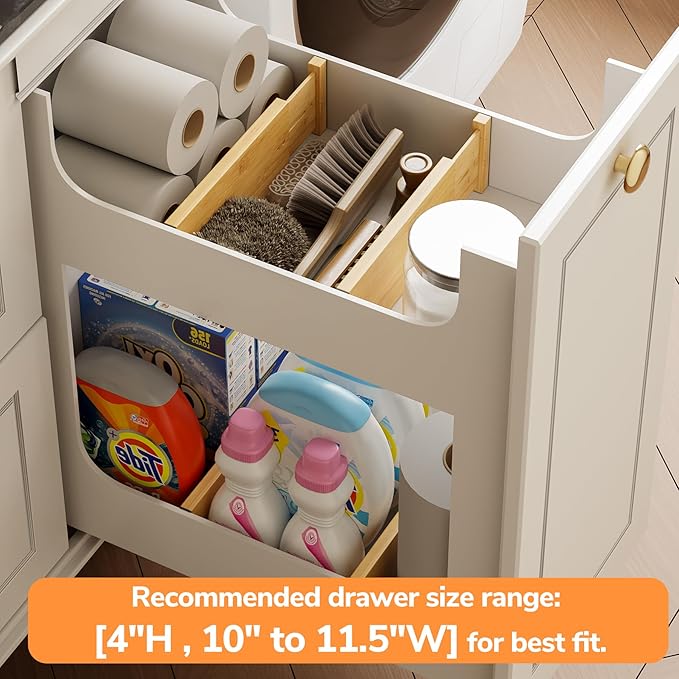 - Expandable design: Each deep drawer divider is 4" H, 0.6"W, and 10" to 12.28"L, which can be adjusted according to the size of the drawer, adapting to different furniture needs. Fits at least 4"H & 10-11.5"W drawers. Do not overstretch—may reduce elasticity if extended beyond recommended length.