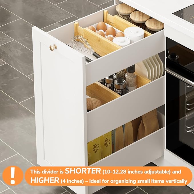 - No Need to Install: This kitchen drawer dividers have a built-in spring structure that eliminate the need for tedious installation steps; Simply push it gently and squeeze both sides inward, the pin comes off instantly and is ready for use