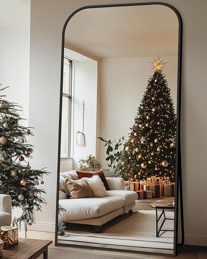 - 【New Arched Top Design & Lightweight】This Floor Mirror features an elegant arched top design, framed with sleek and durable aluminum alloy. Weighing about the same as a medium-sized dog, it is exceptionally easy to move and reposition. Its slim profile and lightweight build make it adaptable to any space while adding a sophisticated charm.