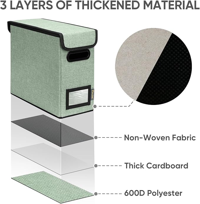 - [DURABLE MATERIAL] The outer layer of our filing box is crafted from high-quality polyester fabric and reinforced with thick cardboard in the middle. This construction ensures that the box maintains its shape and provides better bearing capacity for important documents and files. Its textured appearance can also serve as a stylish decorative element in any office or home
