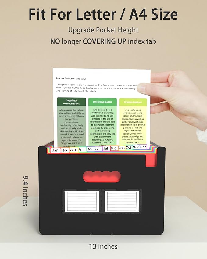 - 【Quick Access & Easy to Categorize】: Bright, color inner pages and Jan - Dec tab, just take a glance and locate. The tabs is clear and easy to read, not obscured by files.Use 2 additional front pockets for business cards, project title cards or notes.