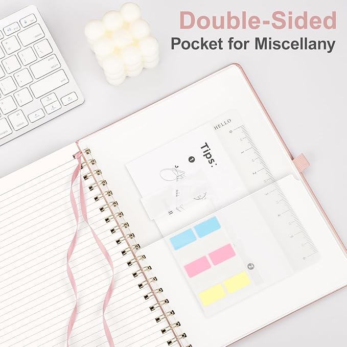 - PRACTICAL LAYOUT: Equipped an elastic band, a pen holder and removable bookmark ruler to keep your notebook organized. Comes with a DIY bookmark with a ribbon for self-attachment to the spiral, serving as a bookmark. Features a double-sided pocket for storing miscellany and 18pcs sticky notes for additional organization and reminders
