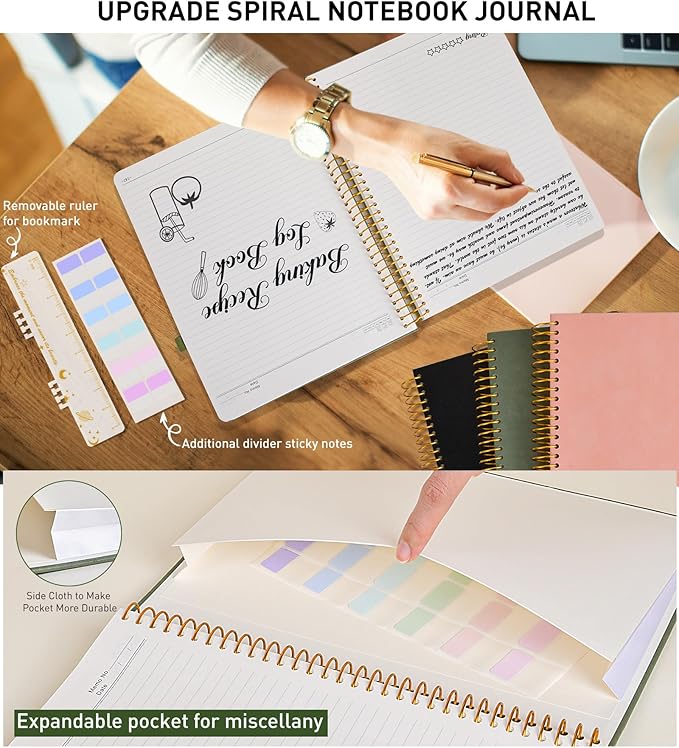 - 【Versatile and Functional spiral Journal】Our journaling notebooks features a sturdy single spiral binding helps you turn the page easily and keeps pages attached reliably. 180° lay flat design makes reading more convenient, and taking notes more efficient. Comes with an elastic closure band ensures that the notebook remains securely closed. Index labels are convenient for you to organize important note-taking notes. Built-in back pocket that is great for storing notes or other important items.