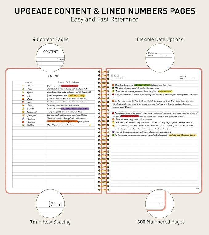 - 【Upgrade Spiral Journal Notebook】Our lined journal notebook is specifically designed to provide you with all the writing space you need. It includes 300 pages numbers and a 4-page blank table of contents. There is enough writing space to help you better categorize and record important matters. You can jot down important notes from various pages and note them in the front of the book for easy and fast reference. Each page has “Memo No” and “Date” header to help you keep track of the date.