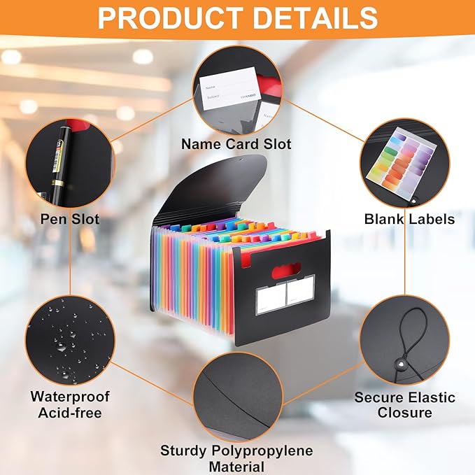 - Design Details: Two business card pockets are designed to easily store many small cards, such as courses, schedules, business cards. Accordion file Organizer comes with small colored labels to help you sort your files. The rope of the bayonet is of two sections and is used according to the thickness of the file