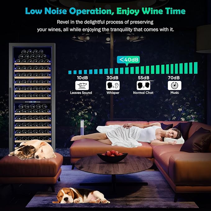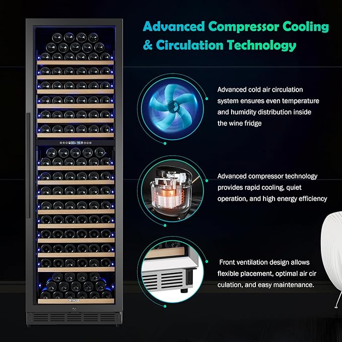 - 200-BOTTLE LARGE CAPACITY & ACTIVATED CARBON FILTRATION SYSTEM - This tall wine fridge offers an impressive storage capacity of up to 200 Bordeaux-style 750ml wine bottles (standard Bordeaux size: 11.8" H x 2.75" W), making it an ideal choice for wine enthusiasts and collectors. The built-in activated carbon filtration system continuously purifies the air, effectively absorbing odors and circulating fresh, clean air throughout the cabinet. This helps maintain an optimal aging environment, ensuring your wines retain their original quality and flavor over time