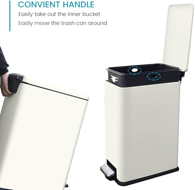 - Duable Stainless Steel: Our slim kitchen trash can with lid is made of Stainless Steel, thick and durable, and anti-fingerprint&Rust. and makes cleaning a breeze! A white finish with a sleek modern look that easily matches any decor.