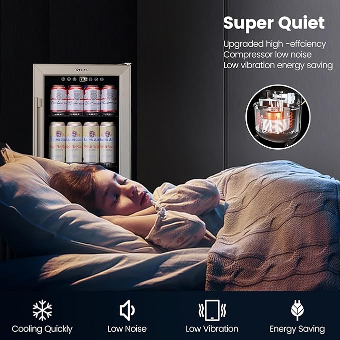 - Upgraded Compressor Beverage Cooler: The under counter beverage refrigerator features an upgraded compressor that quickly cools down your drinks while providing a stable temperature environment. The low vibration operation ensures that your daily life remains uninterrupted while enjoying perfectly chilled beverages