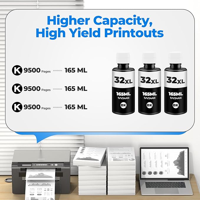 - Contents: The package includes 32xl black ink bottle*3. Totally 3 pack 32xl smart tank ink refill. And they are high capacity smart tank ink bottle set, every 32xl black ink is 165 ML, totally 495 ML 32 xl black ink set. They are the replacements for smart tank 7602 ink bottles, smart tank 5101 ink bottles, smart tank 5000 ink bottles, smart tank 651 ink bottles, smart tank 7001 ink bottles, smart tank 7301 ink bottles, smart tank 5103 ink bottles