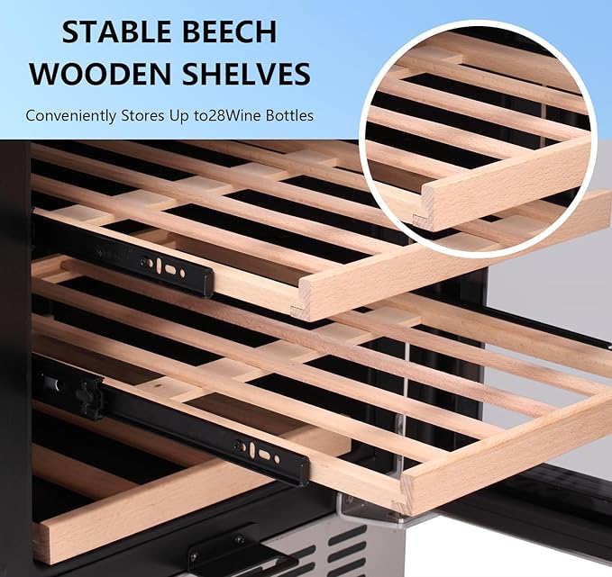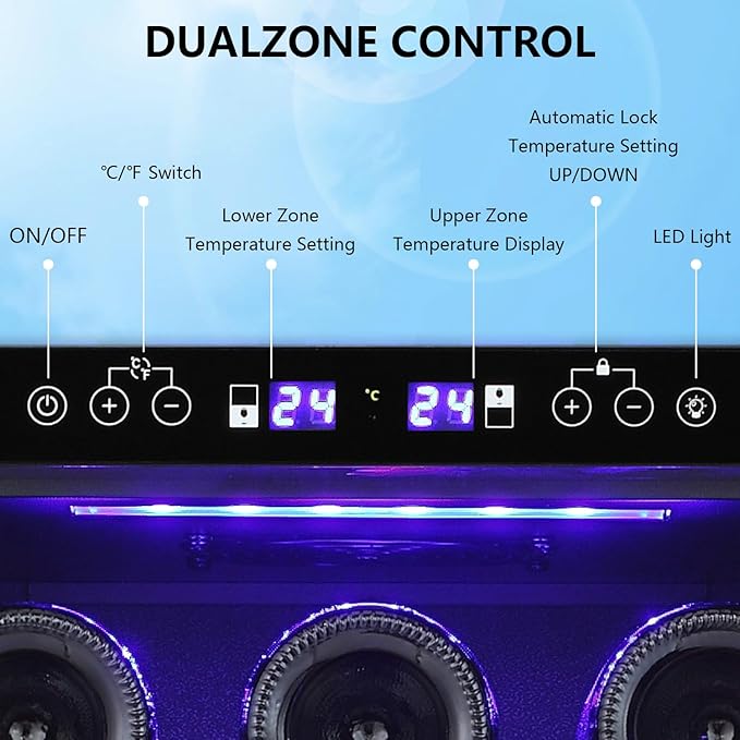 - QUIET & LOW VIBRATION:Advanced cooling system, low vibration effect and noise, allowing your wine to age and settle properly, with no disturbance to its natural occurring sediments. You could change the upper zone temperature from 41-54℉ and the lower zone temperature from 54-68℉, a suitable temperature will give the wine a better taste.