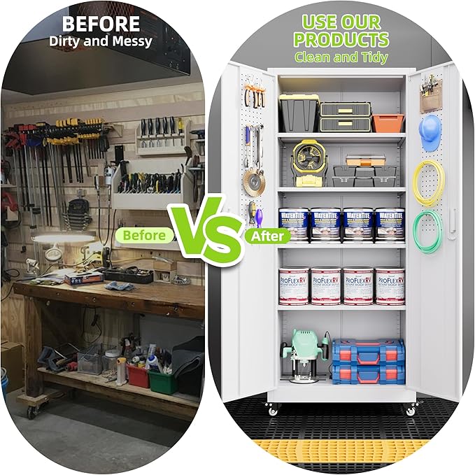 - 【Garage Storage Cabinet】Plenty of storage. "great garage cleanup".You can move them around as needed and the casters and wheels work great on all the different surfaces inyour garage. Extra storage strong and fit your needs, it is sufficient for garage use.