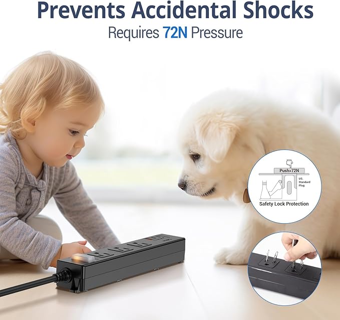 - 【Advanced Safety Features】: Includes a patented safety lock mechanism that requires over 75N of force to open, preventing accidental electric shocks from objects like forks, keys, or children's fingers. Comes with 9-point safety protection, including surge and overload safeguards.