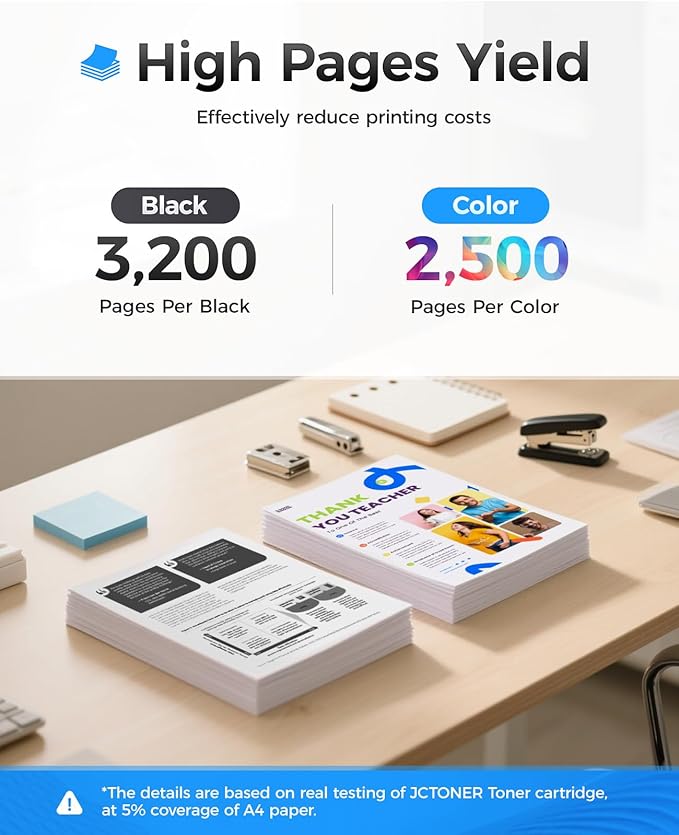 - The latest chip version: The JCTONER toner cartridges are equipped with the latest version of built-in chips, ensuring perfect compatibility between each toner cartridge and the printer. This enables you to print efficiently while maintaining stability and reliability, making installation convenient without the need for manual adjustments. All JCTONER toner cartridges have undergone strict quality testing and have obtained ISO9001 certification. High-quality toner cartridges can meet the demand for high printing volume. The fine toner ensures clear and stain-free printing results and extends the lifespan of the printer. You can purchase with confidence.