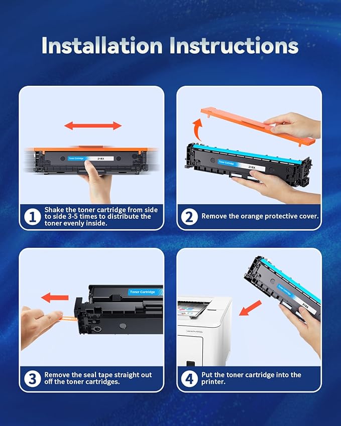 - With Latest Smart Chip: Skydo 218X Toner Cartridges 4 Pack High Yield has been equipped with the latest smart chip to ensure instant recognition and perfect compatibility with your printer. Therefore there is no need to remove the installation chip additionally, which will help you save installation time and make your printing easy and efficient.