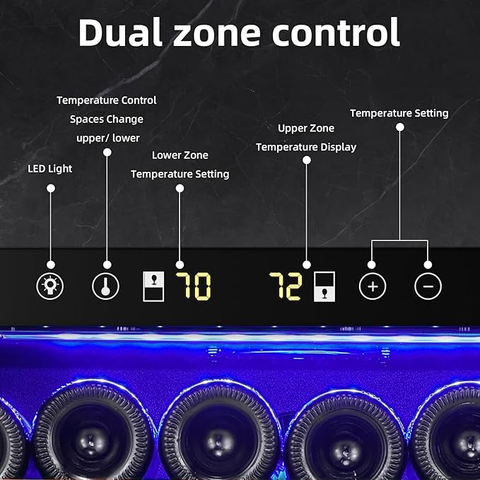 - QUIET & LOW VIBRATION:Advanced cooling system, low vibration effect and noise, allowing your wine to age and settle properly, with no disturbance to its natural occurring sediments. You could change the upper zone temperature from 39℉-50℉ and the lower zone temperature from 50℉-64℉, a suitable temperature will give the wine a better taste.