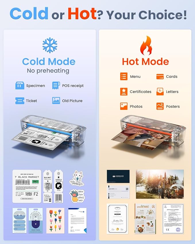 - Smart Hot & Cold Modes: thermal laminator seals at a constant 85°C, creating a waterproof, scratch-resistant protective layer, ideal for thick paper, certificates, and long-term preservation. Cold mode bonds materials and film through mechanical pressure, preventing heat damage, perfect for sensitive items like photos, receipts, and labels. (Note: Cold mode requires self-adhesive pouches, not included.)