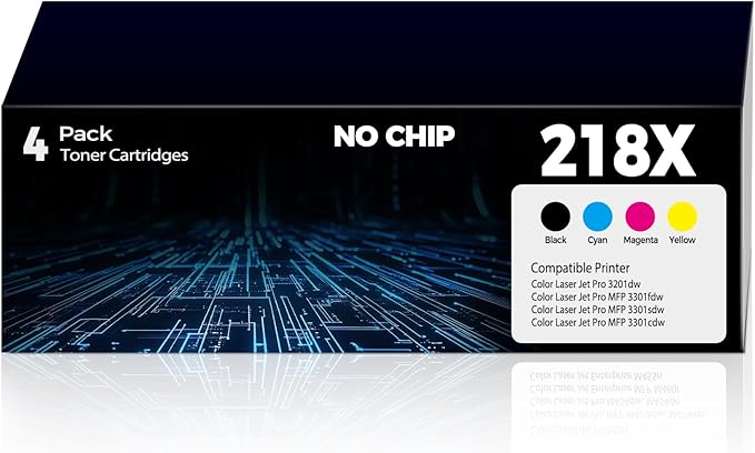 - 218X Toner Cartridges 4 Pack (No Chip) Printer Compatibility: 218X toner are compatible with HP Color Laser Jet Pro 3201dw, Color Laser Jet Pro MFP 3301fdw, Color Laser Jet Pro MFP 3301sdw, Color Laser Jet Pro MFP 3301cdw, Color Laser Jet Pro 3201dw toner cartridges, Color Laser Jet Pro MFP 3301fdw toner cartridges, Color Laser Jet Pro MFP 3301sdw toner cartridges, Color Laser Jet Pro MFP 3301cdw toner cartridges, 3301 3302 Series Wireless All-In-One Laser Printer.