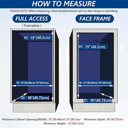 - Minimum cabinet size required: 18" D x 12" W x 21" H; slide-out trash can size: 10.6“ W x 16” D x 17.7” H (height of trash can included). Note: The screws that link to the cabinet door are 12mm (0.47“), so the minimum thickness of the door needs to be 15mm (0.59”) or more. When using under the sink and in cabinets, please measure the size and space to make sure the product fits in your cabinets
