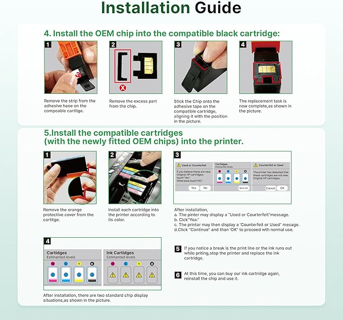 - Chip Replacement Guide: ①You need to remove the original chips on ink cartridges through our tool. ②Peel off the tape of the new compatible cartridge and Stick the chip onto the tape