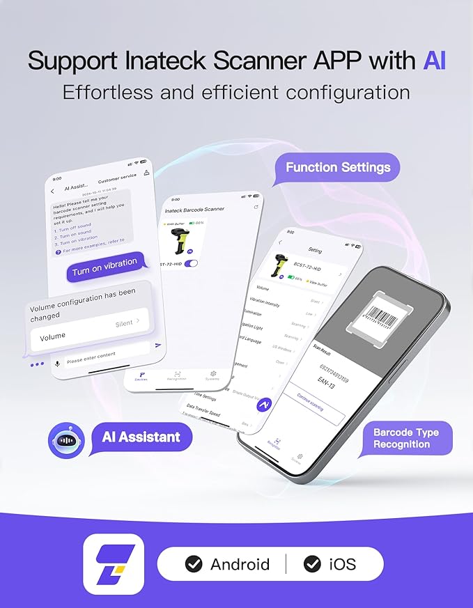 - Wide Compatibility & Versatile Scanning Modes: Supports 2.4G wireless, Bluetooth, and wired connections, compatible with Windows, Mac, iOS, Android, iPad OS, and Linux. Choose from manual, continuous, or auto-sensing scanning modes, with light, sound, and vibration notifications. Ideal for inventory management, storing up to 270,000 barcodes (13 characters each)