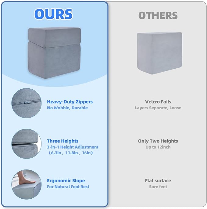 - [3-IN-1 HEIGHT ADJUSTMENT] Customize your footrest to 6.3" (16cm), 11.8" (30cm), or 16" (41cm) with a simple detachable design—perfect for any body type, chair height, or space. Stack layers for elevated leg support or remove tiers for a compact fit under desks, sofas, or gaming setups. Reduce leg fatigue and improve posture during work, relaxation, or long gaming sessions.