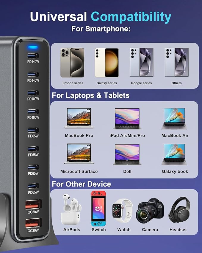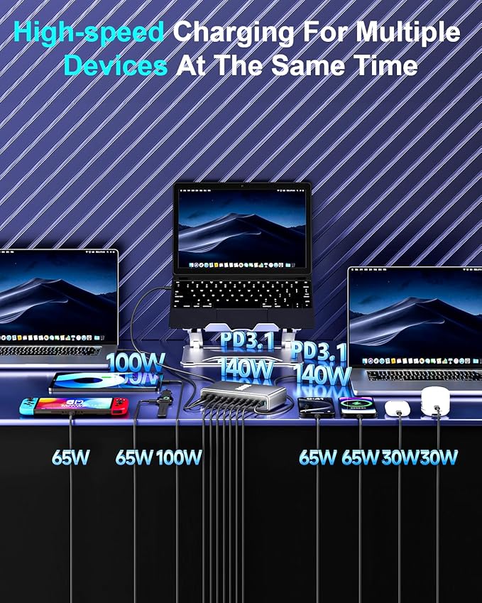 - Wide Compatibility: The 800W USB C charging station supports PD3.1,PD3.0/PPS, QC, PE2.0, AFC, FCP, SCP, 5V/3A fast charging protocols and is compatible with MacBook Pro 16“, 14”, 13”, MacBook Air, iPad Pro , iPhone 16 Pro/15 Pro/14 Pro Max/13/12, Switch, Samsung Galaxy S23 Ultra/S22, Steam Deck and more