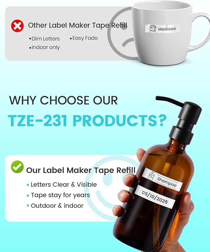 - 【White Label Tape Easy to Use】Tze-231 12mm 0.47 black ink on white tape and the backing tape is separated from the centre, making it easy to peel the label off the backing and Tears off cleanly without separating the adhesive from the tape, allowing for easy replacement