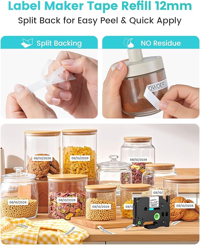 - 【Replacement for P Touch Label Tape Durable and Non-fading】Label maker tape refill 0.47 and Compatible with brother label maker tape 12mm 0.47 white won't fade even when exposed to sunlight, won't flake or curl over time. 1/2 white label tape strong adhesion, water withstand, wear withstand, corrosion withstand, high and low temperature withstand, grease withstand