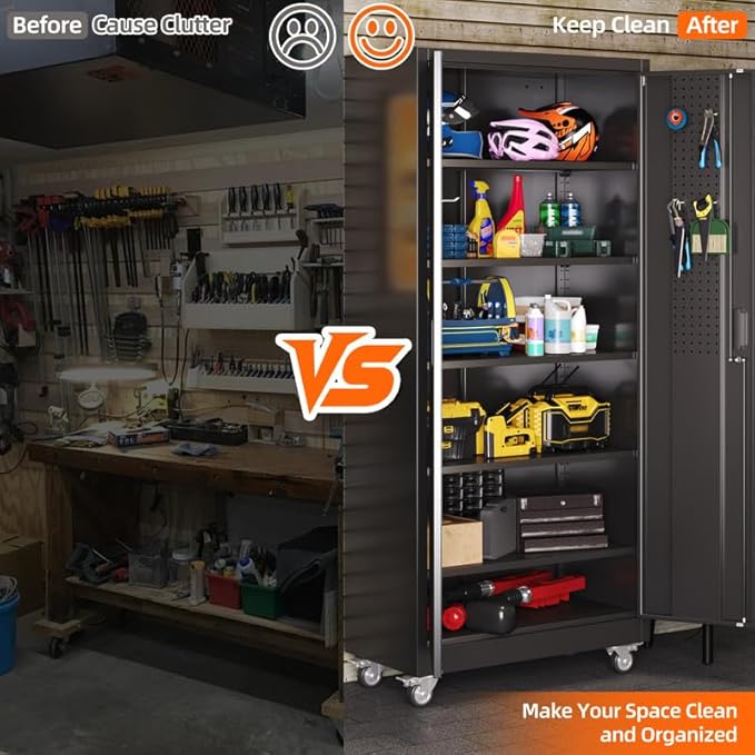 - 【Garage Storage Cabinet】Plenty of storage. "great garage cleanup".You can move them around as needed and the casters and wheels work great on all the different surfaces inyour garage. Extra storage strong and fit your needs, it is sufficient for garage use.
