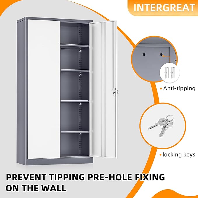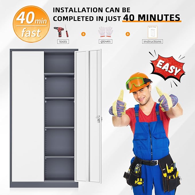 - 【Easy assembly】: Metal storage cabinet with 2 locking doors can be assembled step by step. There are 4 pre-holes on the back of the steel cabinet, you can screw it to the wall for stability.