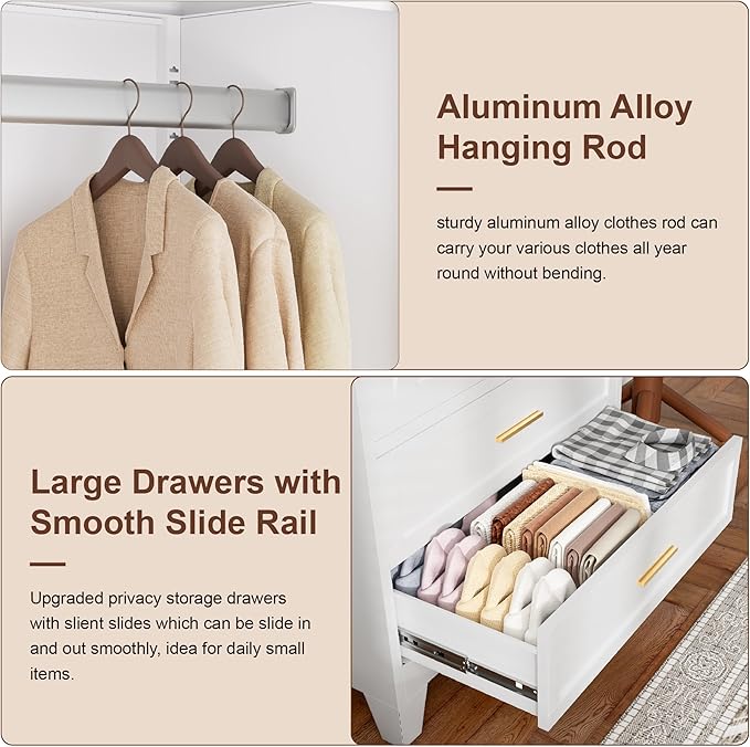 - Convenient Drawers Design: The bedroom armoire includes two spacious drawers at the bottom, providing storage space for smaller items such as underwear, socks, or others. The smooth glide system ensures a hassle-free opening and closing