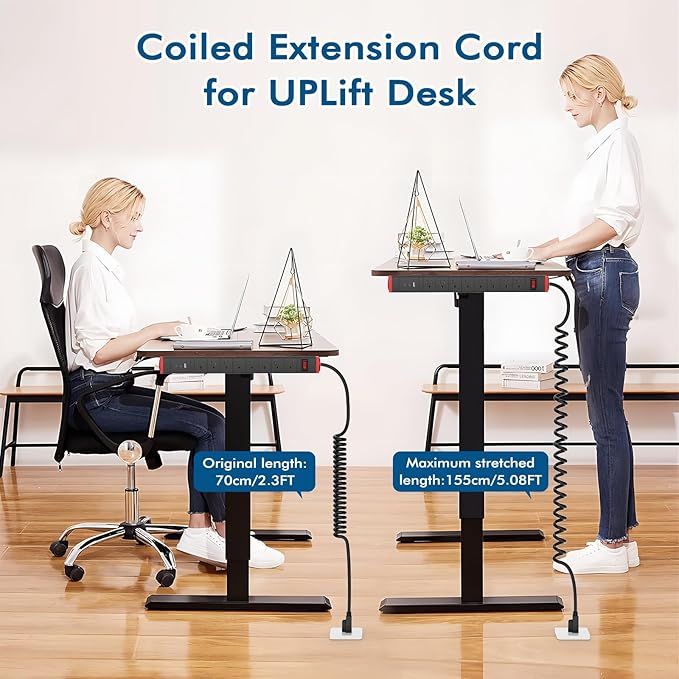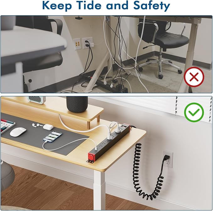 - Surge Protector Power Strip with Coiled Cord: The 8 wide spaced power strip turns one wall outlet into 8 with 1200 joules of surge protection, protecting your home/office equipment TV, computer, printers,and routers from voltage fluctuations, surges, and spikes. And with a coiled power cord.Coiled cable keep things neat and organized,that makes it a perfect match for using with a standing / adjustable desk.
