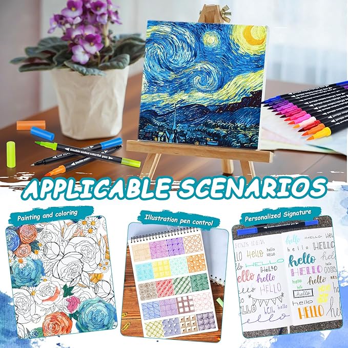 - 【Wide Application, Smooth Writing】The brush tip of the dual brush tip & fine point markers for adult coloring book is suitable for shading and quick coloring in large-area artworks, and the fine tip is perfect for outlining contours and details. Widely used, the deluxe coloring markers set is suitable for adult coloring books, bullet journals, account books, comics, card making, sketching, illustrations, planners, design, art projects, etc. Dual-tip watercolor pens are must-haves for school supplies, back-to-school supplies, classrooms, and teachers