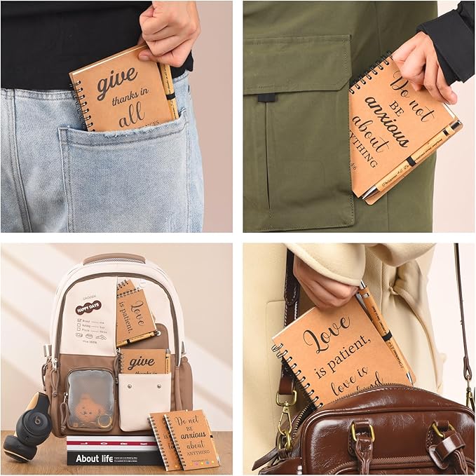 - Scripture Notebook & Pen Set – Includes 3 spiral-bound notebooks and 3 bamboo pens, each featuring a unique Bible verse. Ideal for personal reflection, journaling, or sharing with others.
