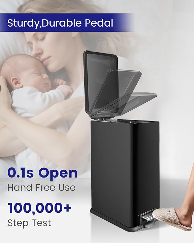 - High quality steel: our slim bin with lid is made of stainless steel, thick and durable, as well as anti-fingerprint and rust and makes cleaning easy! A white finish with a sleek, modern look that easily matches any decor.