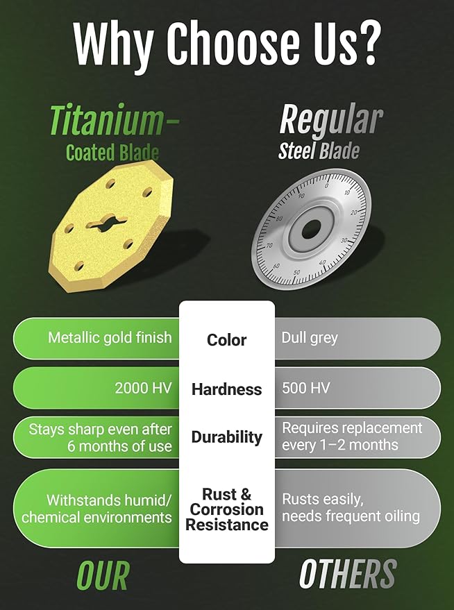 - TITANIUM-COATED BLADE: Tired of box cutter blades that dull after just a few uses? Our electric scissors are equipped with a titanium-coated SKS7 blade, a premium high-carbon alloy steel that delivers razor-sharp precision even after 100,000+ continuous cuts.Unlike ordinary blades that wear down quickly, SKS7 offers: higher hardness, superior wear resistance and extended cutting life — perfect for high-frequency, professional use