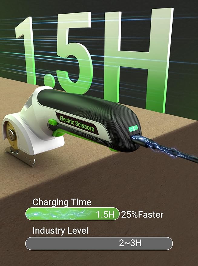 - LONG RUNTIME AND QUICK CHARGING: This electric box cutter is equipped with a 2000mAh battery and a powerful 300RPM motor (more efficient than 220RPM models). Enjoy up to 60 minutes of runtime, while most electric scissors for cardboard only last 40. The recessed charging port keeps the cable stable and secure during every charge and recharge in just 1.5 hours via USB