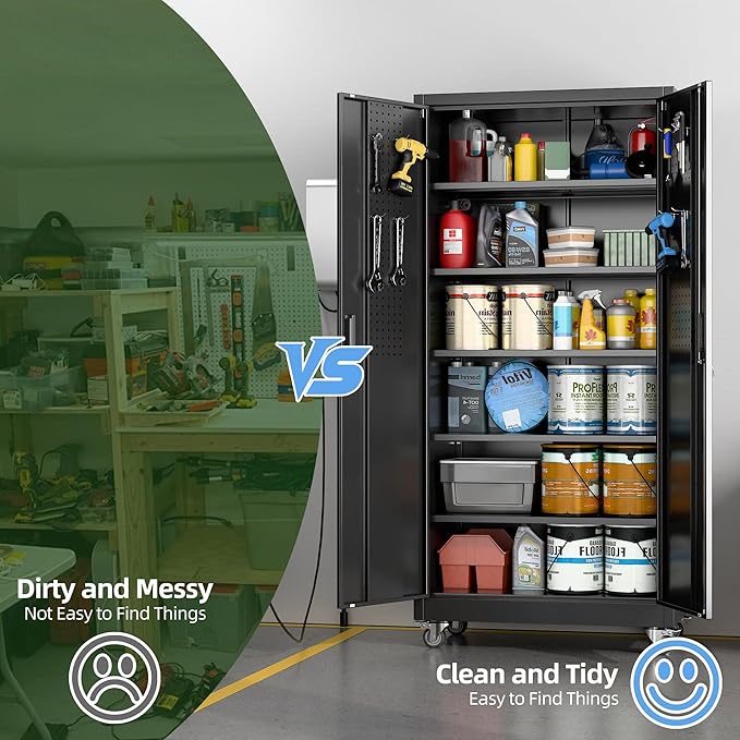 - [Garage Storage Cabinet] Plenty of storage. "great garage cleanup".You can move them around as needed and the casters and wheels work great on all the different surfaces inyour garage. Extra storage strong and fit your needs, it is sufficient for garage use.