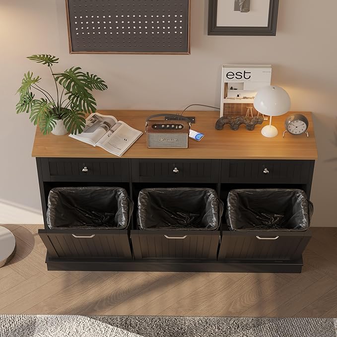 - Multifunctional Storage Hub: More than just a trash cabinet! Use it as a laundry hamper in the utility room, a dining room waste bin, or even a charging station—the built-in power outlet keeps devices powered up. The metal hinges holds the door tilt open for both hands to dispose of waste, while the drawer organizes trash bags and supplies