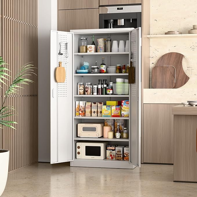 Aobabo Upgraded 71" H×34" W×18" D Metal Garage Storage Cabinet with Pegboards, Lockable Steel Cabinet with 5 Adjustable Shelves and 4 Hooks for Garage, Home, Office, White,Assembly Required