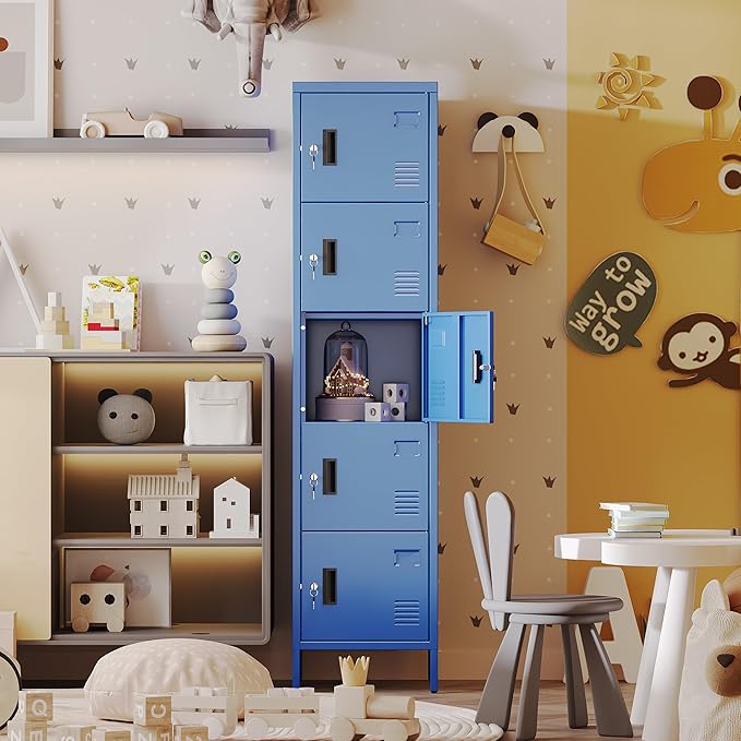 Aobabo 16" W 5 Door Metal Storage Locker with Lock, 66" H Steel Locker with Name Card Holder and Metal Leg for School, Home, Office, Playroom, Assembly Required, Blue