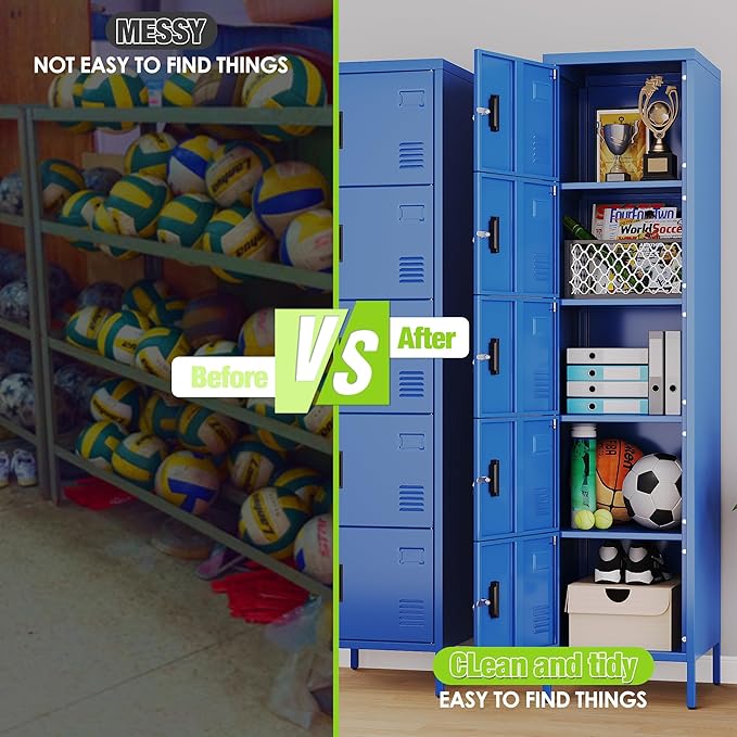 - Sleek Blue Aesthetic:This 5 door metal storage locker in a stylish blue color not only offers secure storage but also adds a modern touch to any home, office, or gym environment. With dimensions of 66.18"H×15.75"W×15.75"D, it provides ample space without taking up too much floor area.