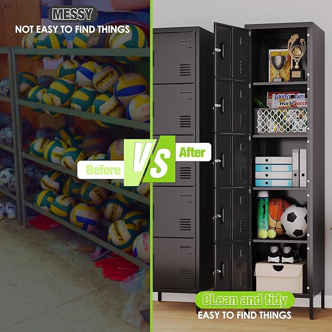 - Sleek Black Aesthetic:This 5 door metal storage locker in a stylish black color not only offers secure storage but also adds a modern touch to any home, office, or gym environment. With dimensions of 66.18"H×15.75"W×15.75"D, it provides ample space without taking up too much floor area.